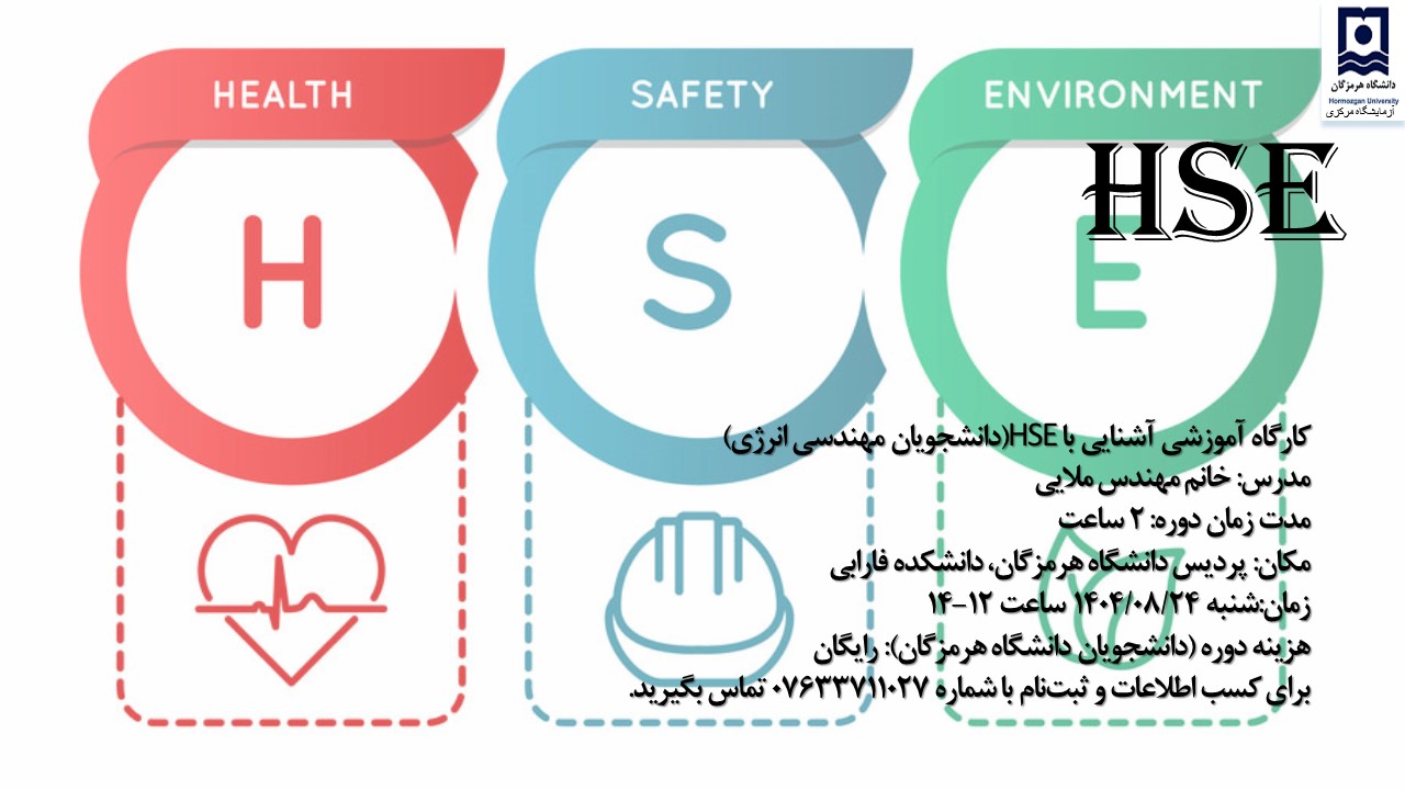 در ادامه سلسله کارگاه‌های آموزشی ایمنی، آزمایشگاه مرکزی دانشگاه هرمزگان دوره HSE (ایمنی، بهداشت و محیط‌زیست) را این بار ویژه دانشجویان جدیدالورود رشته مهندسی انرژی برگزار می‌کند.