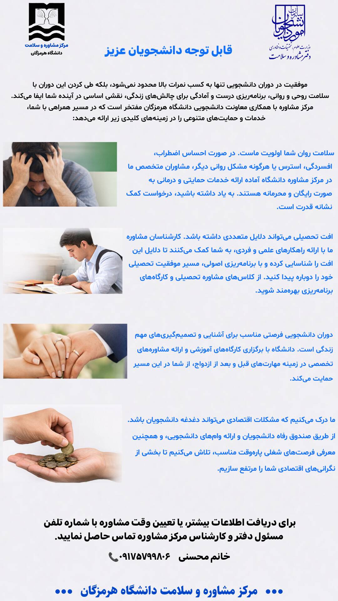 معرفی سامانه مشاوره آنلاین(سامانه سام) آغاز ثبت نام وام دانشجویی نیمسال اول 1402-1403 زمان بندی اعطای وام های تحصیلی و شهریه در نیمسال دوم 1401-1402 پذیرفته شدگان سوابق تحصیلی بهمن ماه 1401 متقاضی خوابگاه بروزرسانی سامانه فاز 2 صندوق رفاه دانشجویان تخفیف 25./. درمانگاه گلشهر برای دانشجویان اطلاعیه سلامت جسم دانشجویان اطلاعیه سرویس های ایاب و ذهاب دوشنبه مورخه 1401/8/30 راهنمای ثبت نام در سایت دانشگاه شماره حساب درآمدهای اختصاصی دانشگاه آغاز ثبت نام وام های دانشجویی 1402-1401 پروتکل های جدید بهداشتی مبارزه با کووید-19 (ویروس کرونا) در دانشگاه ها/ دانشکده ها/ مراکز آموزش عالی ثبت نام در سامانه تغذیه برنامه حرکت سرویس های ایاب و ذهاب دانشجویان دانشگاه هرمزگان در سال تحصیلی 1401 جشنواره بین المللی فرهنگ ملل اطلاعیه مهم سلف سرویس اطلاعیه تخلیه خوابگاه ها در ایام تعطیلات تابستان برنامه زمانبندی استفاده دانشجویان از سالن مطالعه کتابخانه مرکزی زمان ملاقات معاون محترم دانشجویی با دانشجویان گرامی ارائه خدمات رسانی سلف سرویس وام ضروری و ویژه دکتری